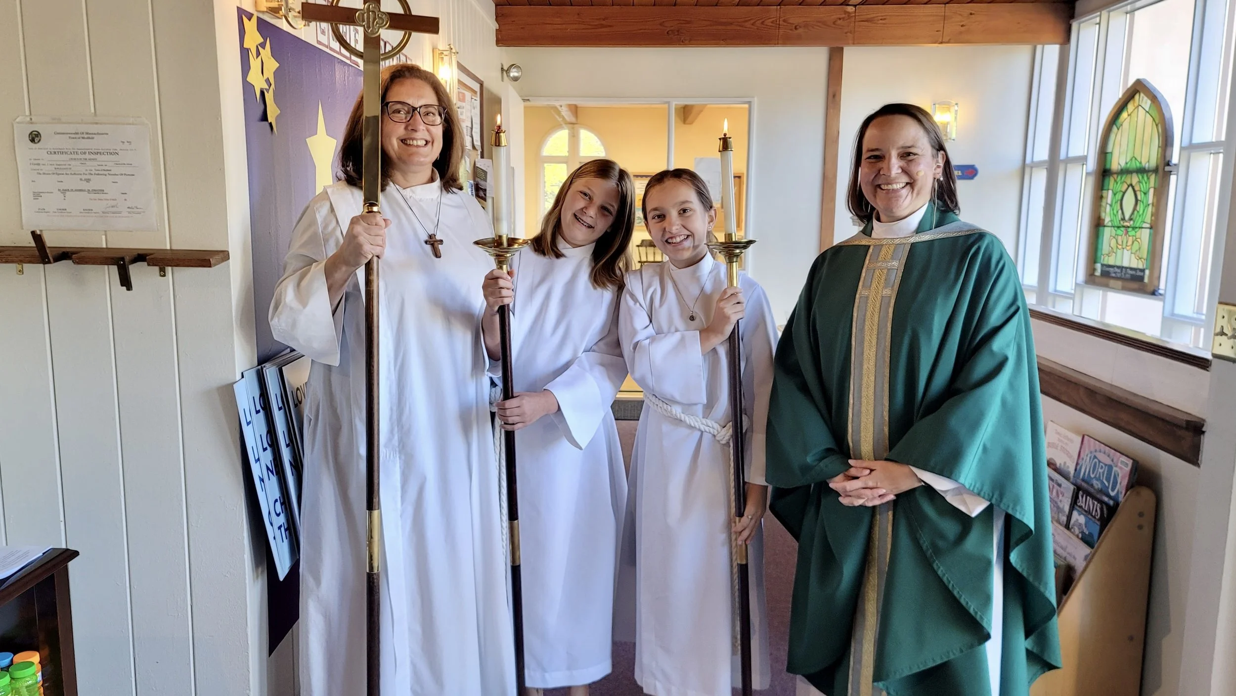 Young people 10 and older are invited to help lead worship. Acolytes carry the cross and torches (candles) in the procession and hold the book during the reading of the Gospel. Sign up here.